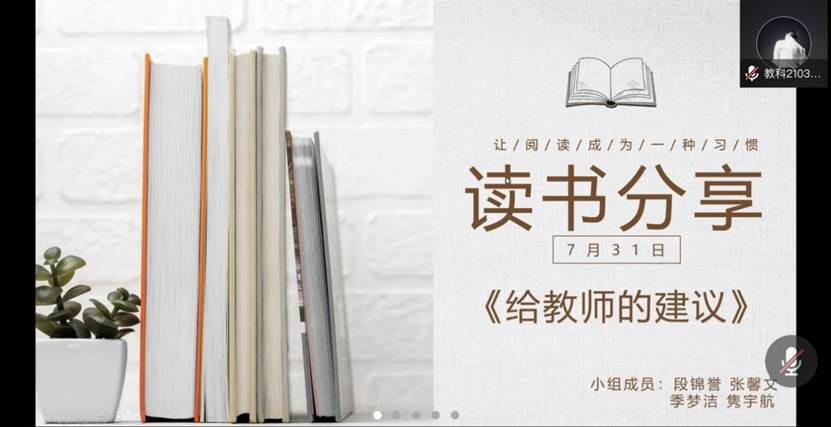 教科网8月3日电(记者 张金)外物之味,久则可厌;读书之味,愈久愈深。读书使人充实,思考使人深邃,交谈使人清醒。为了共同探寻心灵的居所,同享读书之乐,淮阴师范学院教育科学学院行知班于7月31日晚在线上举办了暑假第二次读书分享会活动。本次活动由教科2105班张怡舟主持,行知班全体成员参加本次活动。