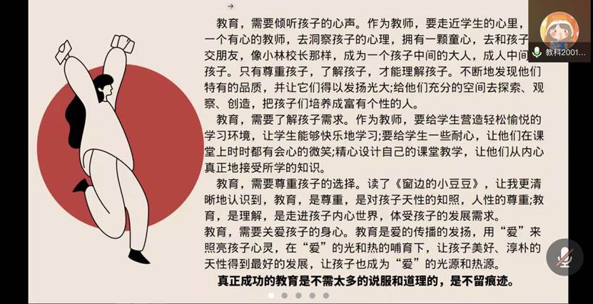 最后,戚甜甜分享了自己关于《窗边的小豆豆》的体会。她说,从这本书中,自己获得了很多快乐和感动,正是因为小林校长的耐心和老师的因材施教,才有了“巴学园”的存在,巴学园一些本质的东西,是值得我们学习和借鉴的,这是个性化教育的核心所在,也是我们努力的方向。