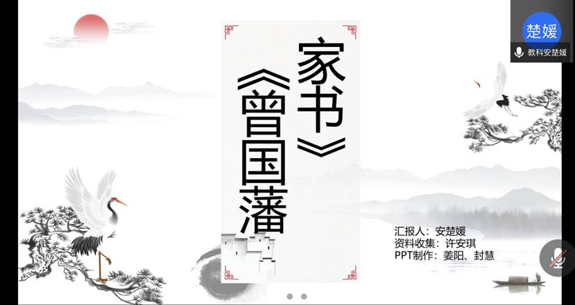 首先由安楚媛代表小组发言。她从作者简介、内容概述、主要思想和读后感悟四个方面对《曾国藩家书》进行介绍。她说,透过曾国藩的家书,我们看到了一代名人重臣深厚的学识造诣和道德修养,感受到了他骨子里那份对家人的浓浓亲情?!凹壹笤蛐?,人勤则?。荒芮谀芗?,永不贫贱。”安楚媛用曾国藩的十六字家训与大家共勉,希望大家能不忘初心,清清白白做人,堂堂正正做事,树立时代薪火相传的家风。