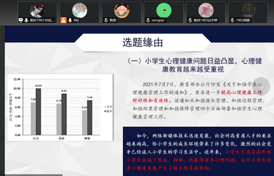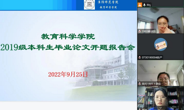 教科网9月27日电(记者 王蕊)毕业论文是本科教学实践环节的重要组成部分,是培养学生科研能力的重要途径。而毕业论文开题报告是本科生毕业论文撰写的重要环节。为了规范本科生毕业论文撰写过程,提高学生毕业论文写作质量,教育科学学院小学教育、学前教育、教育技术学和应用心理学等四个专业,按照《淮阴师范学院教育科学学院2019级学生毕业论文工作的实施意见》文件要求,近期按专业、分小组举行了本科生毕业论文开题报告会。
