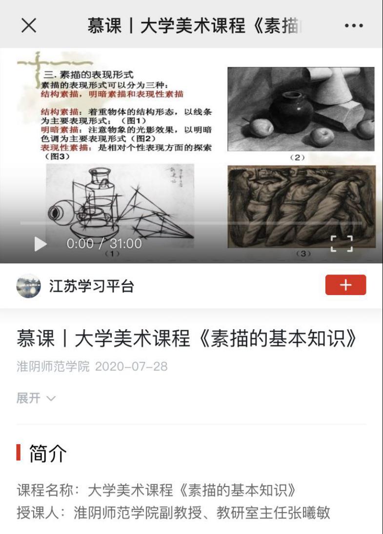 近日,淮阴师范学院教育科学学院副教授、教研室主任张曦敏老师的大学美术课程《素描的基本知识》在学习强国平台正式上线。